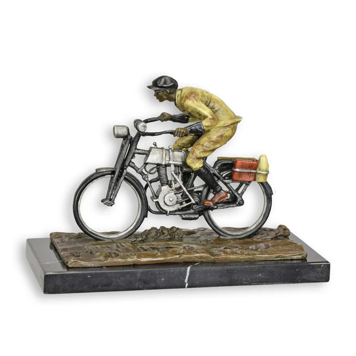 A BRONZE SCULPTURE OF A MAN ON A BIKE