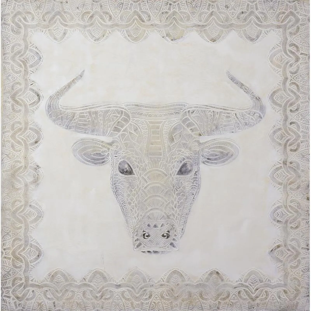 A FRAMED OIL PAINTING IN RELIEF, DEPICTING A BULL HEAD
