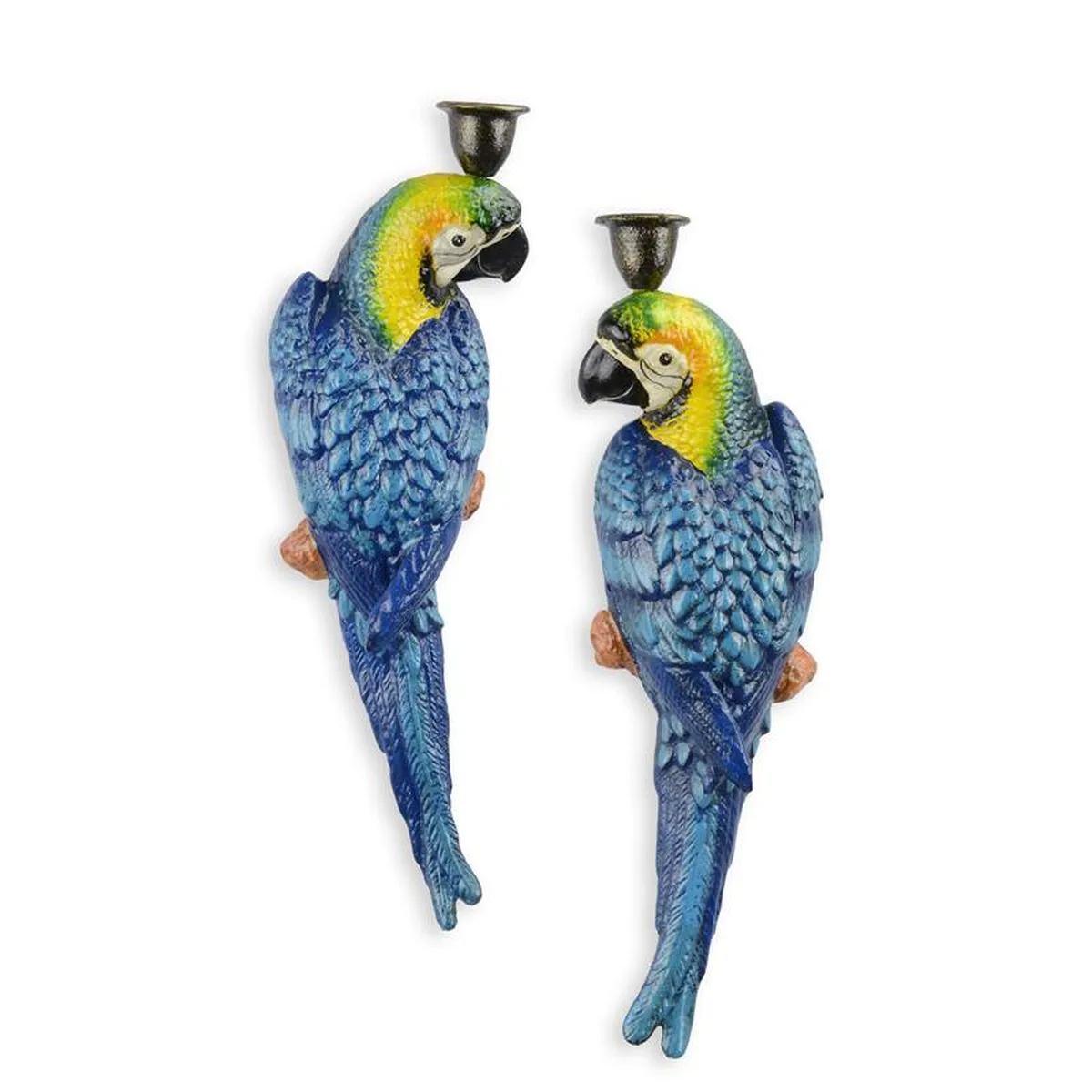 A PAIR OF CAST IRON BLUE AND YELLOW MACAW CANDLEHOLDERS