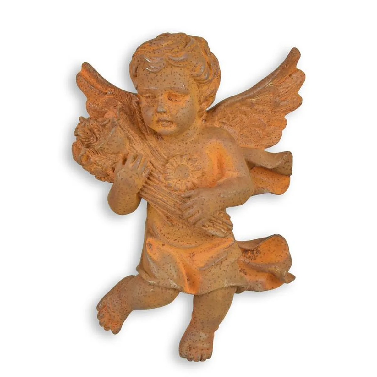 A RUSTY CAST IRON WALL MOUNT PUTTO HOLDING FLOWERS