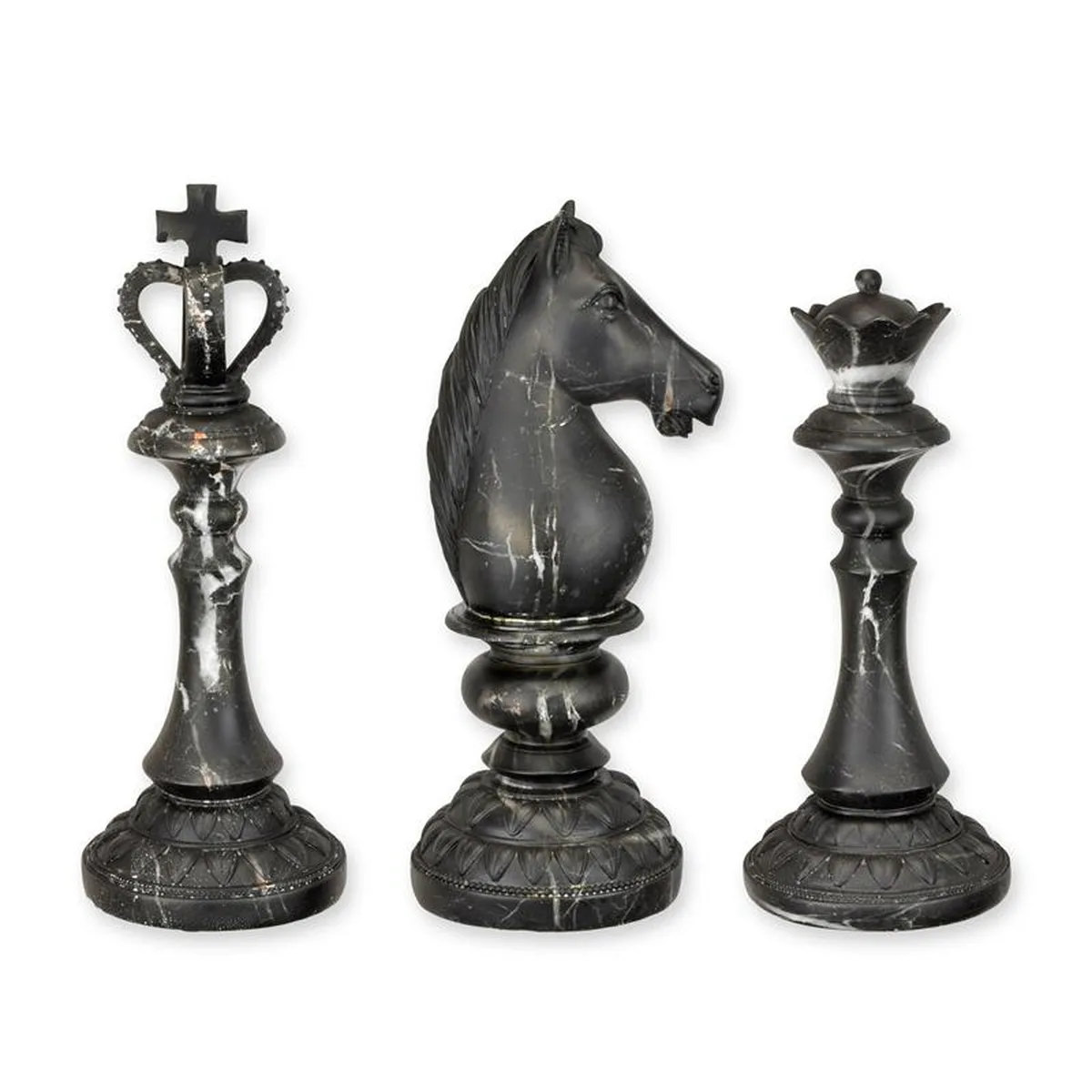 A SET OF 3 RESIN CHESS PIECES IN A MARBLE LOOK